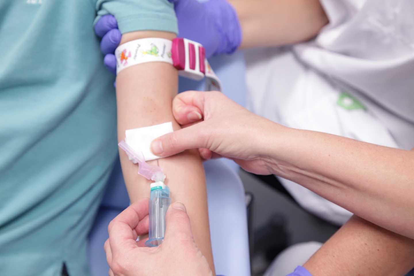 l’infirmi(è)r(e) rempli les différents tubes. Quand elle a fini, elle place une compresse sur ton bras.