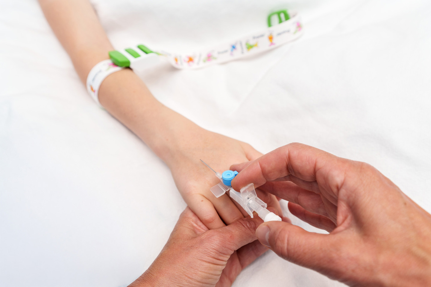Vous recevrez une perfusion. Un fin tube en plastique restera dans votre main. Vous pouvez rester allongé dans le lit ou vous asseoir sur les genoux de votre accompagnateur pendant la mise en place de la perfusion. Vous pouvez regarder ce qui se passe, mais ce n'est pas nécessaire.