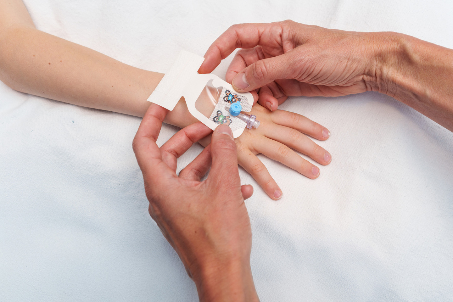 We plakken een pleister over het infuus, zodat deze goed op zijn plaats blijft.