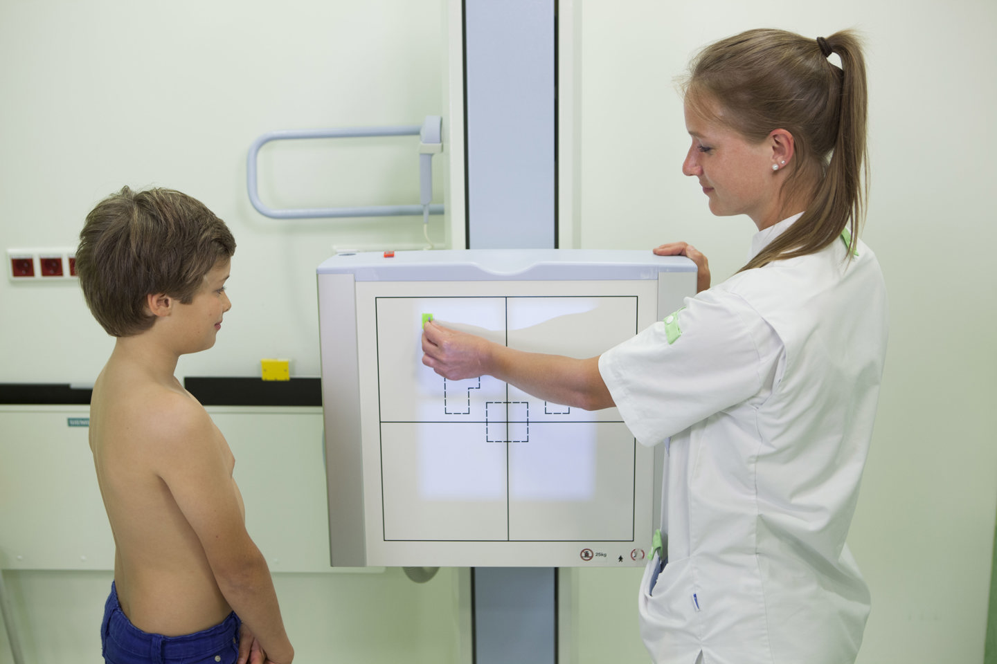 De laborante gaat naar een kamertje. Door het raam kan zij jou goed zien terwijl zij de foto’s maakt. Het apparaat maakt een brommend geluid. Als een foto gemaakt wordt moet je heel stil staan.